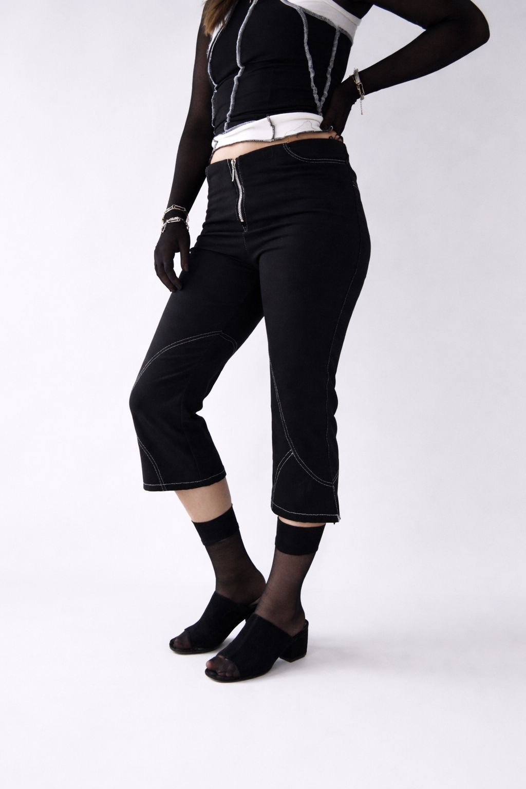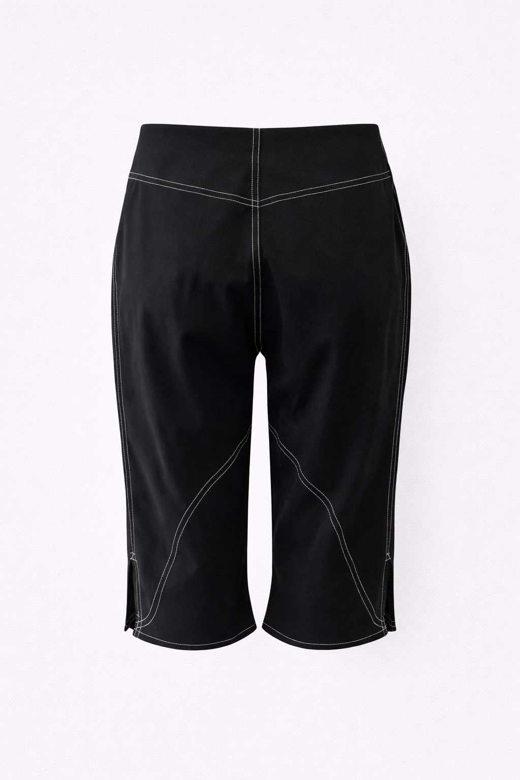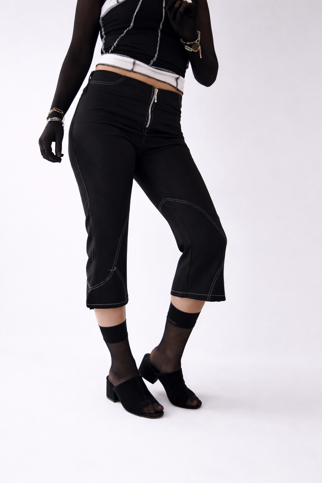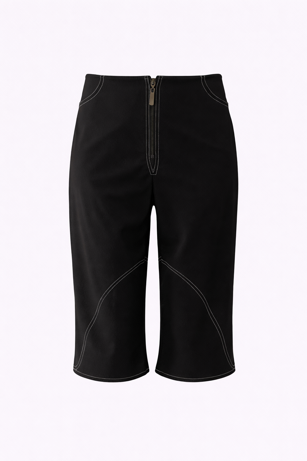 Le pantalon capri en lainage d’été noir propose une silhouette nette et raccourcie. Les découpes dessinent la jambe et apportent une structure discrète, tandis que la longueur capri libère le mouvement.